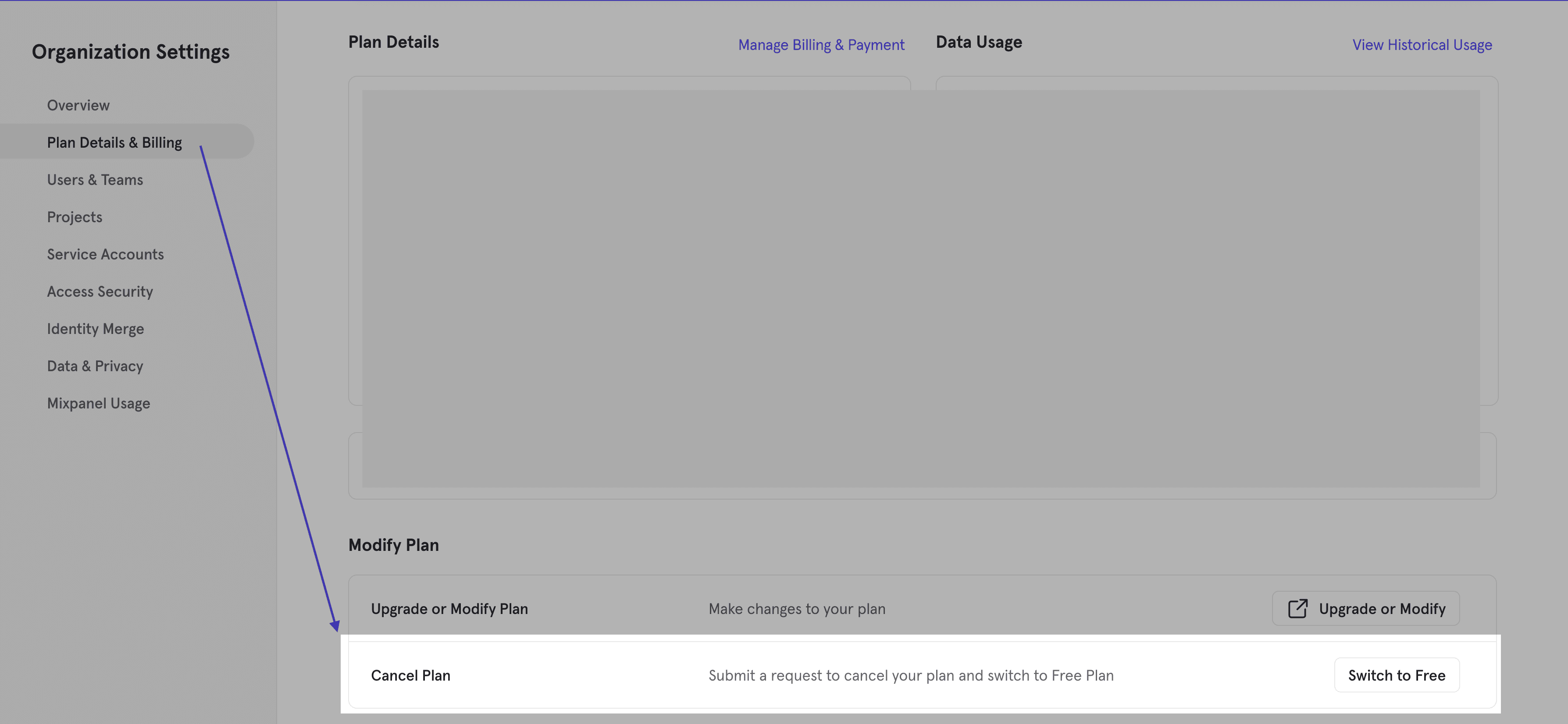 You can only edit or downgrade your plan if you have “Owner” or “Billing Admin” permissions over your Mixpanel organization: